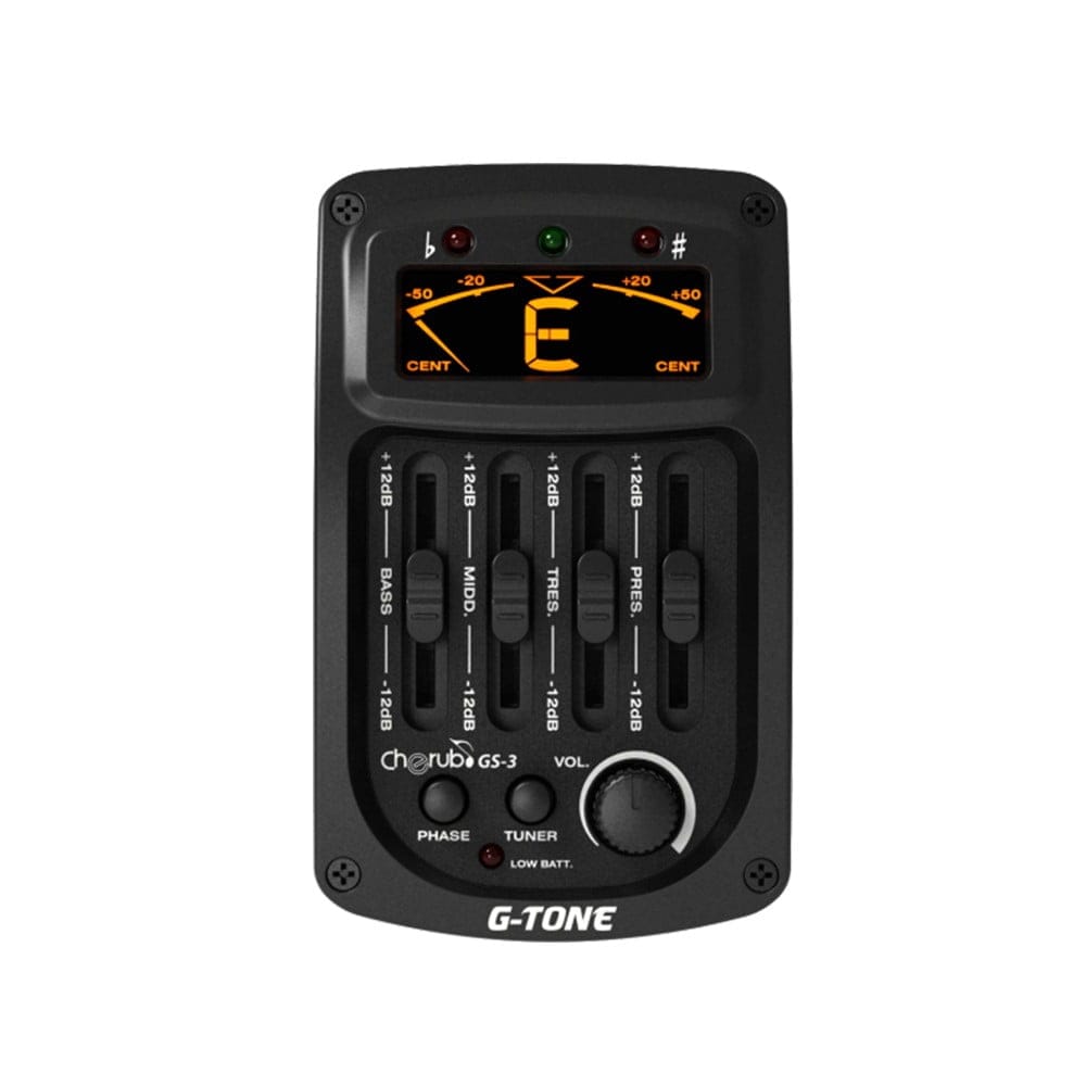 Cherub GS-3 is an acoustic guitar onboard preamp that has 4 band EQ, Phase Reversal and a built-in chromatic tuner with high definition LCD display. It has Low Battery alert to remind you to change new batteries. GS-3 is easy to be installed into a guitar and its size is only 55mm*92mm*33mm.