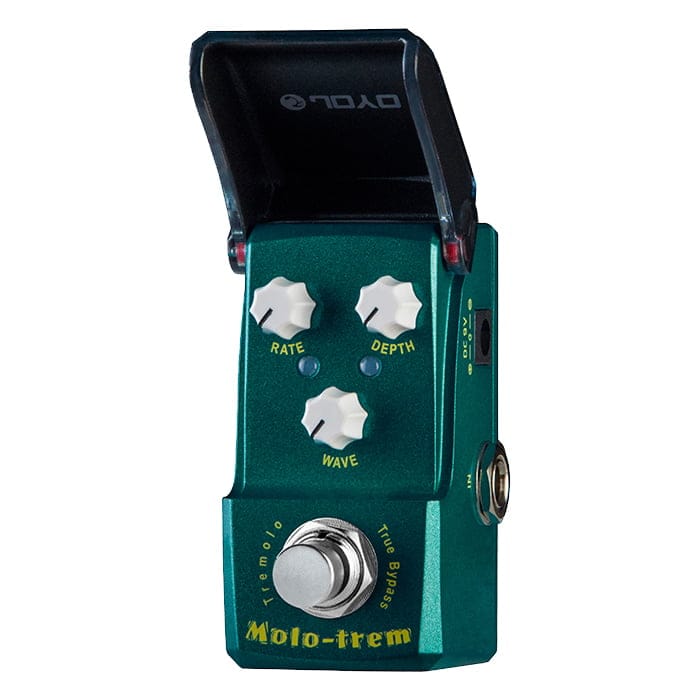 The Molo-Trem is a Tremolo that utilizes a photoelectric circuit, it sounds just like one of the tremolos you could find in vintage tube amps. It’s flexible yet easy to use. Molo-Trem is a simple three knob control allows for adjustment of Rate (Speed), Depth (how much does the volume fluctuate) and Wave. The Wave knob is very cool because you can change it from a subtle triangle wave to a drastic square wave. This way you can achieve the classic tremolo sounds we all know and love as well as the more modern “stutter” sounds to create amazing rhythmic pads, especially if combined with a cool delay sound. (Like the FILTER delay from our QUATTRO pedal)
